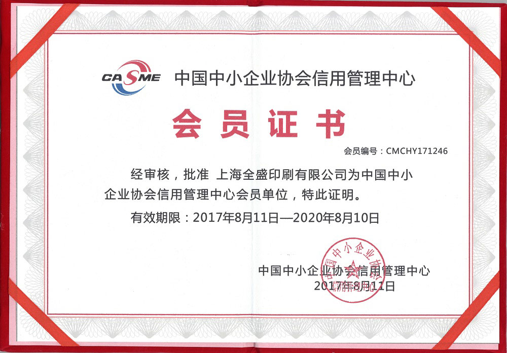中国中小企业协会信用管理中心会员证书