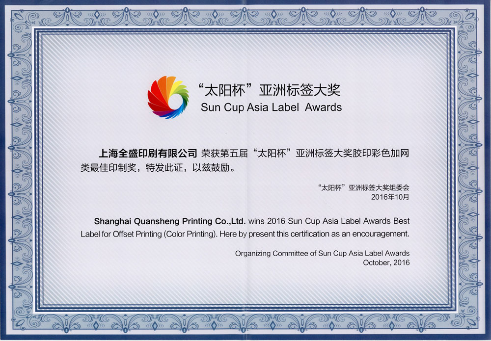 “太阳杯”亚洲标签大奖赛最佳印制奖